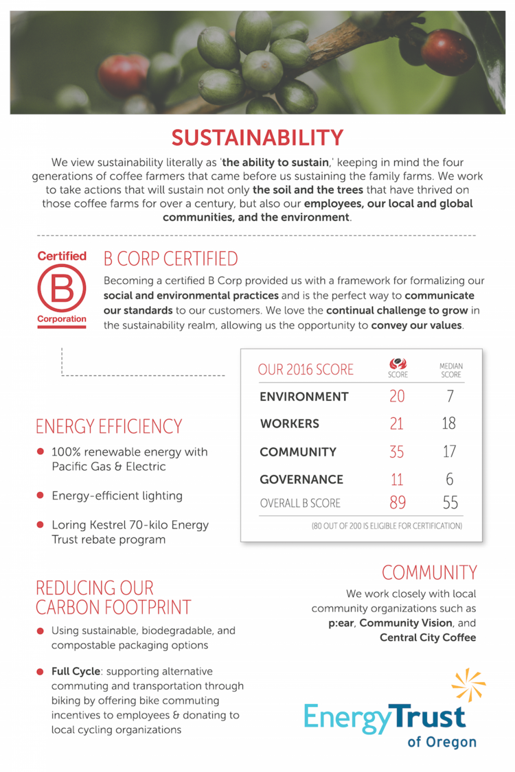 In our family, the word ‘sustainability’ means taking care of the soil, the trees, the people, and the environment. We focus on the ‘Full Cycle’ of coffee, which encompasses the tight-knit relationships we have with our farmers, our energy-efficient roaster in Portland, and our baristas who have refined their craft. We are proud to be part of the B Corp community, affirming our commitment to use business as a force for good.