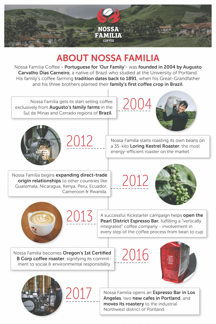 Nossa Familia Coffee is a specialty coffee roaster founded by Augusto Carneiro, whose family has been growing coffee in the highlands of Brazil since the 1890s. Consistently named one of Portland's best coffee roasters, Nossa Familia is also the first B Corp Certified roaster in Oregon, signifying a deep commitment to sustainability. Nossa Familia works directly with coffee farmers around the world to source high-quality specialty coffee from origins like Brazil, Guatemala, Nicaragua, Peru, Ethiopia, and more. Nossa Familia supplies beans and equipment to cafés, restaurants, hotels, and offices primarily in the Pacific Northwest, including its own self-operated cafés.